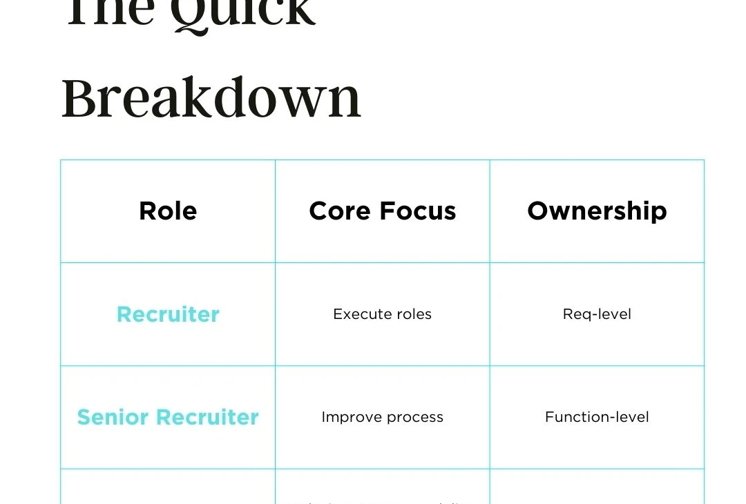 The Recruiter role typically focuses on executing hiring processes for standard positions, with responsibilities ranging from sourcing to interview coordination, screening candidates and managing the pipeline, etc..
