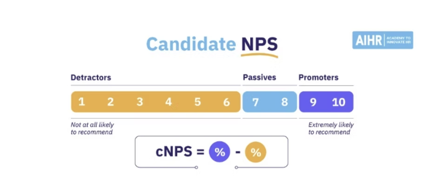 Definitions: Candidate Net Promoter Score (cNPS) is a metric that measures how likely candidates are to recommend your company as a place to work. It is calculated by subtracting the percentage of detractors (those who rate their experience as 6 or lower on a scale of 0 to 10) from the percentage of promoters (those who rate their experience as 9 or 10). A positive cNPS indicates that you have more promoters than detractors, and a negative CNPS indicates the opposite.