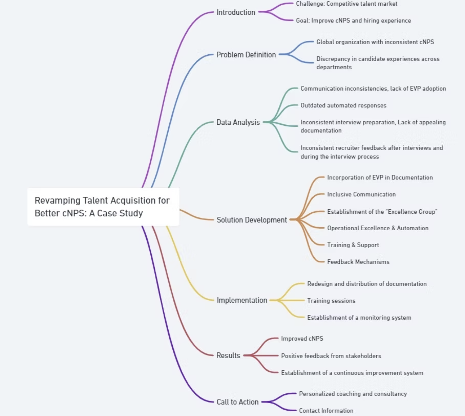In this case study, I will show you how to develop and launch a new program to improve your cNPS in the talent acquisition department. I will follow a basic case study framework, which consists of 4 steps: define the problem, analyse the data, develop solutions, and implement recommendations.